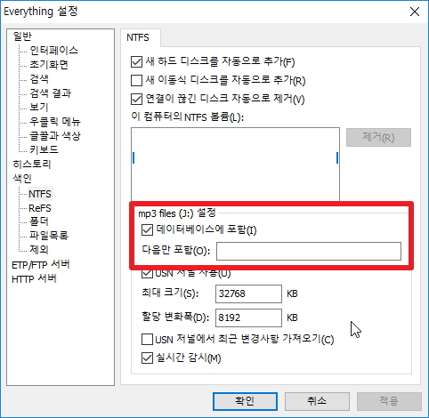 다음만 포함은 여기에 포함될 폴더만 넣으면 그것만 데이타베이스에 포함된다.